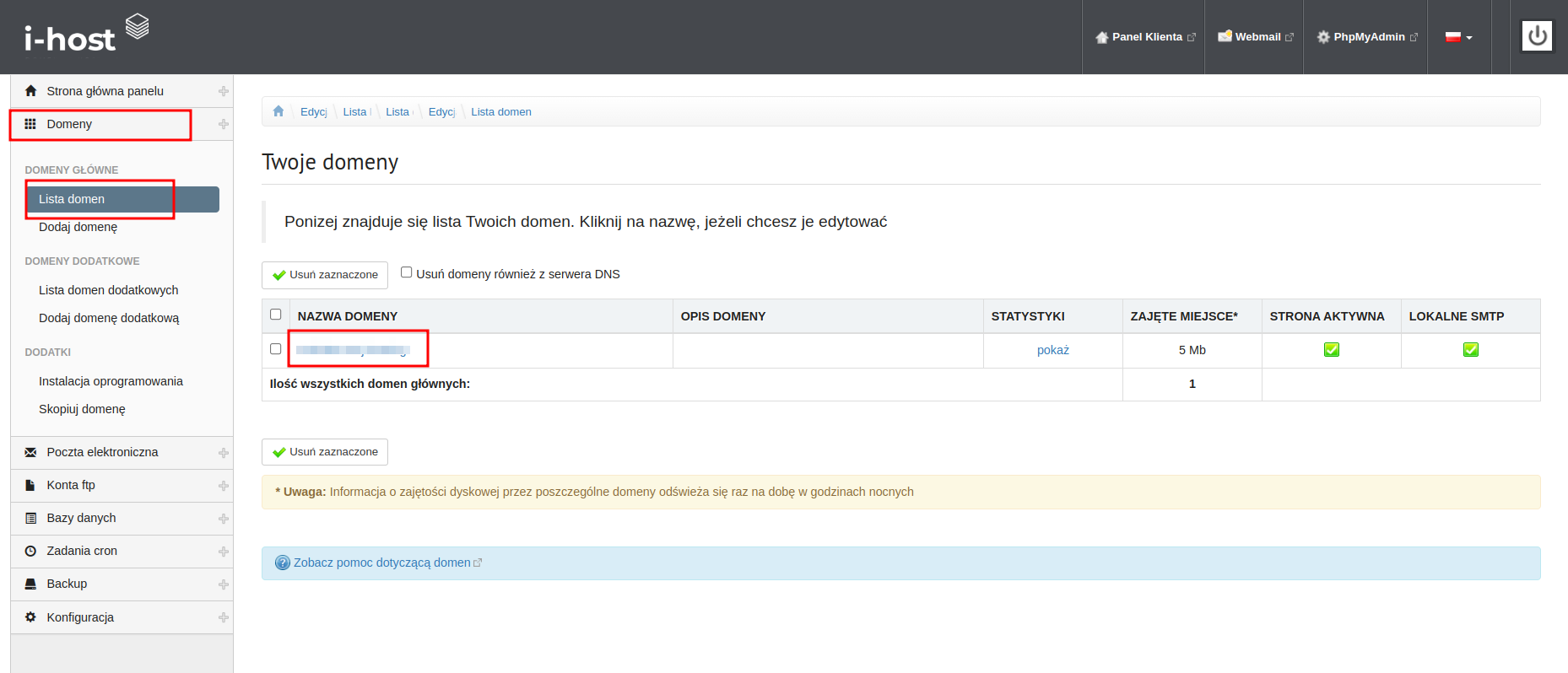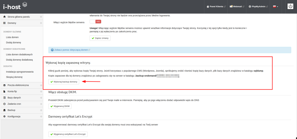 Aby wykonać backup należy wejść w zakładkę Domeny -> Lista domen, następnie klikamy w naszą domenę, poniżej znajdziemy przycisk Wykonaj backup domeny. Po kliknięciu zostanie wykonany backup strony wraz z bazą danych, następnie pojawi się on w zakładce Lista backupów.