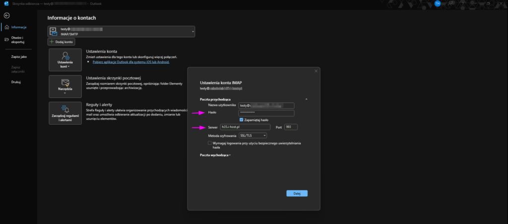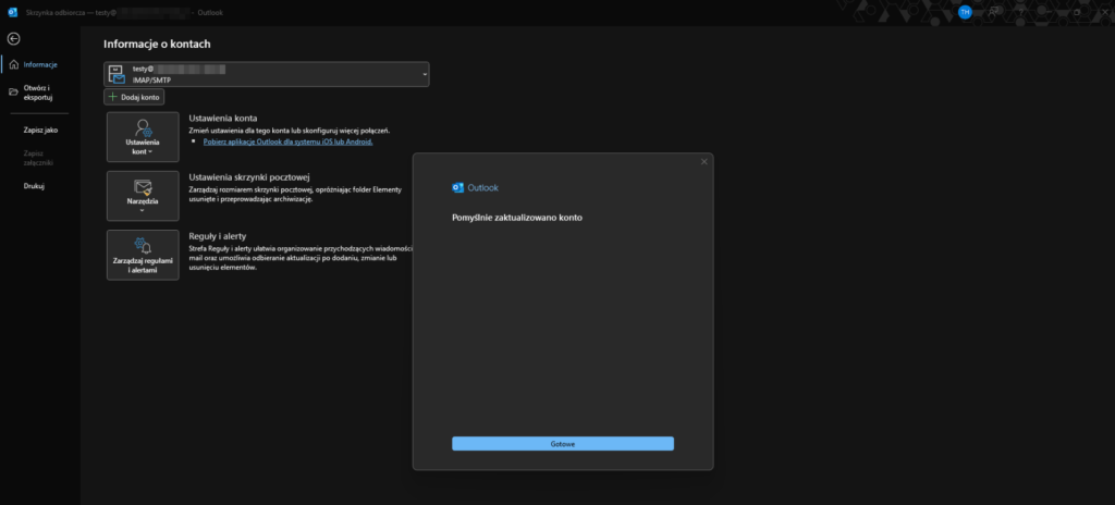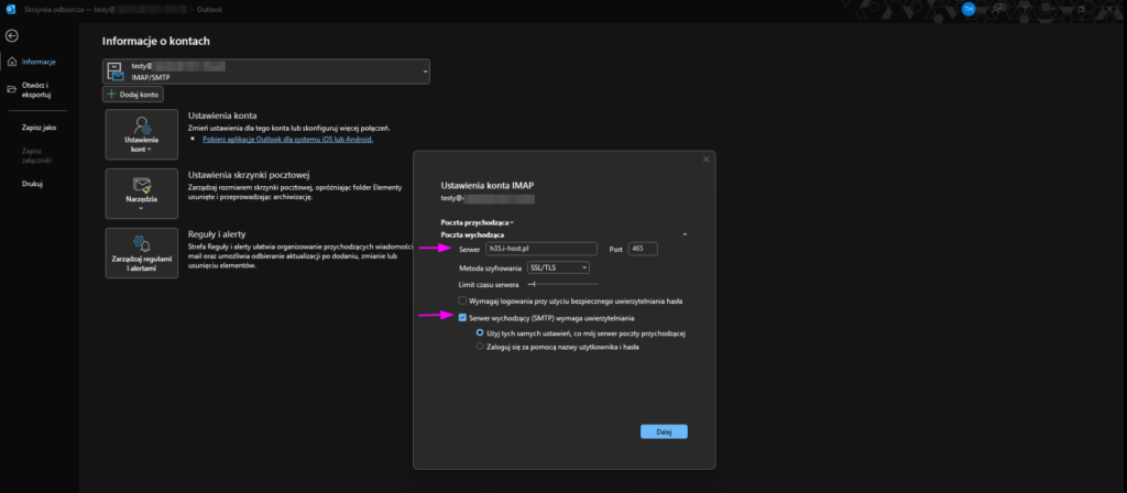 Jeśli masz już utworzone i poprawnie skonfigurowane konto w Outlook, to możesz przejść do jego edycji, np. aby zmienić adres serwera poczty przychodzącej (IMAP) lub wychodzącej (SMTP) na inny.