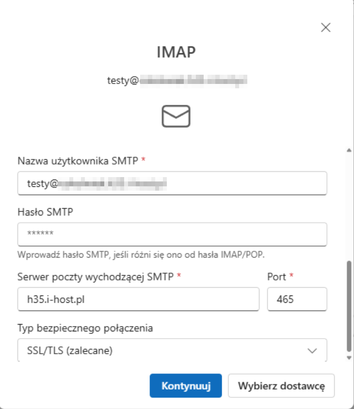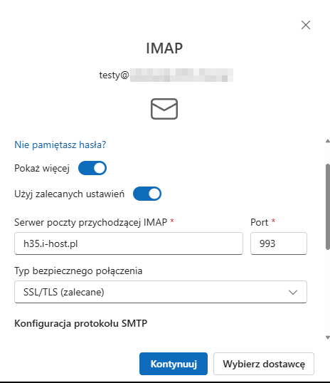 Uzupełnij formularz konfiguracji poczty przychodzącej IMAP oraz wychodzącej SMTP, przy czym: