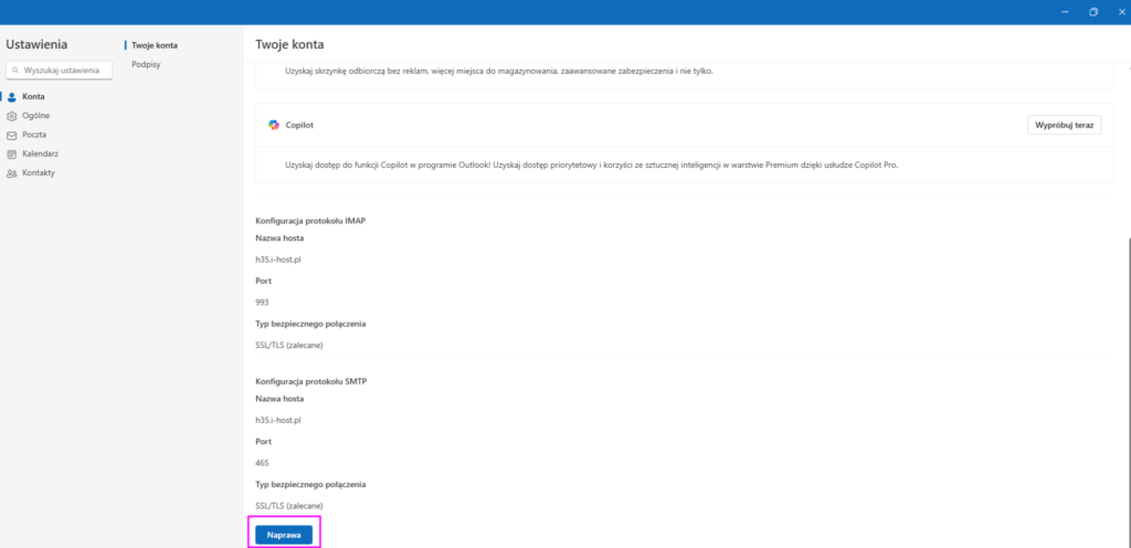 Ukaże się zakładka Twoje konta oraz aktualna konfiguracja konta. Kliknij Naprawa, aby poprawić konfigurację: