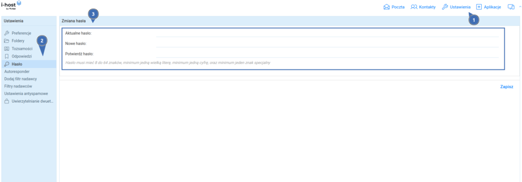 Po zalogowaniu się na swoją skrzynkę pod adresem poczta.i-host.pl wejdź w Ustawienia, a następnie z listy po lewej stronie wybierz zakładkę Hasło.