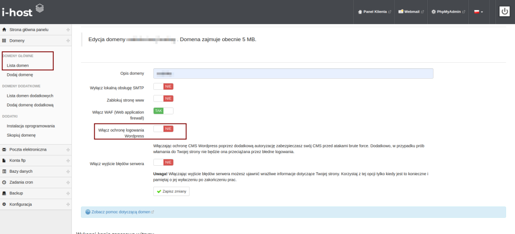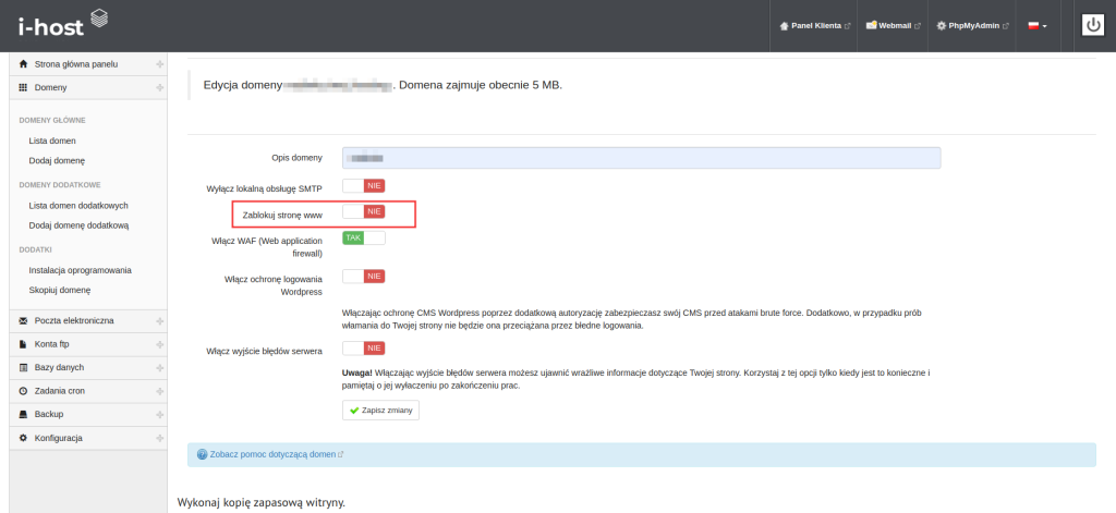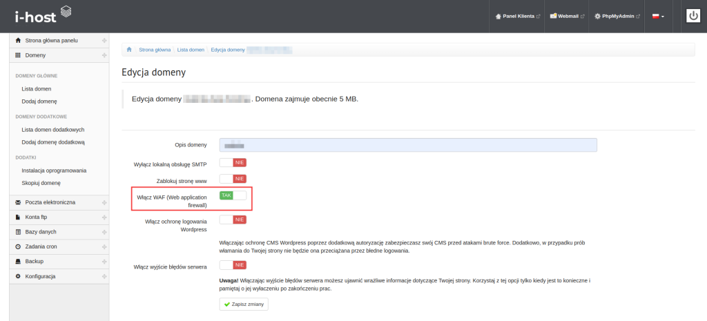 Aby wprowadzić zmiany na stronie, należy najpierw wyłączyć WAF. Następnie zmodyfikować stronę i ponownie uruchomić WAF.