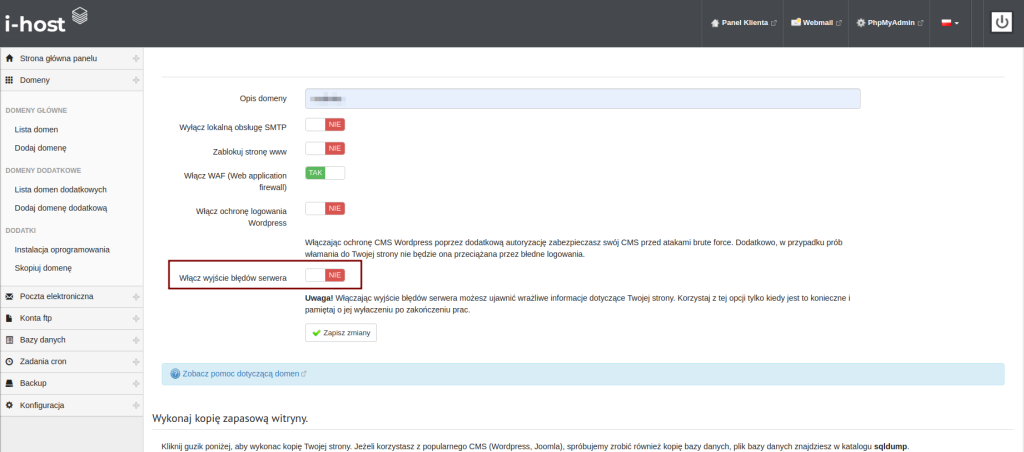 Ta funkcja jest domyślnie wyłączona i pokazuje błędy, jakie zwraca serwer.