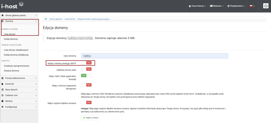 W tym miejscu można edytować ustawienia domeny. Po wybraniu domeny z listy, którą chcemy zarządzać, pojawią się opcje do skonfigurowania.