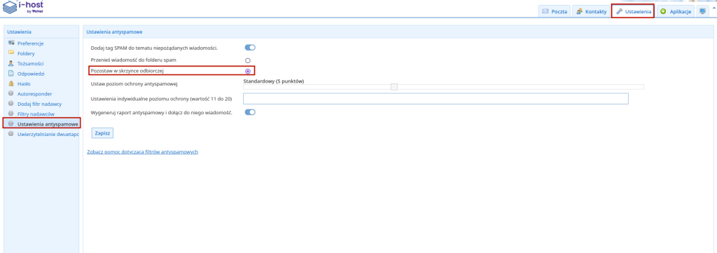 UWAGA! Jeśli wyłączymy Dodaj tag SPAM i Wygeneruj raport oraz ustawimy, by wiadomość trafiała do skrzynki odbiorczej, to nie będzie widać, że wiadomość jest spamem.