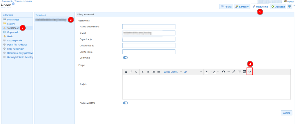 • jeśli posiadasz kilka tożsamości, to jedna z nich będzie ustawiana jako domyślna przy wysyłce wiadomości