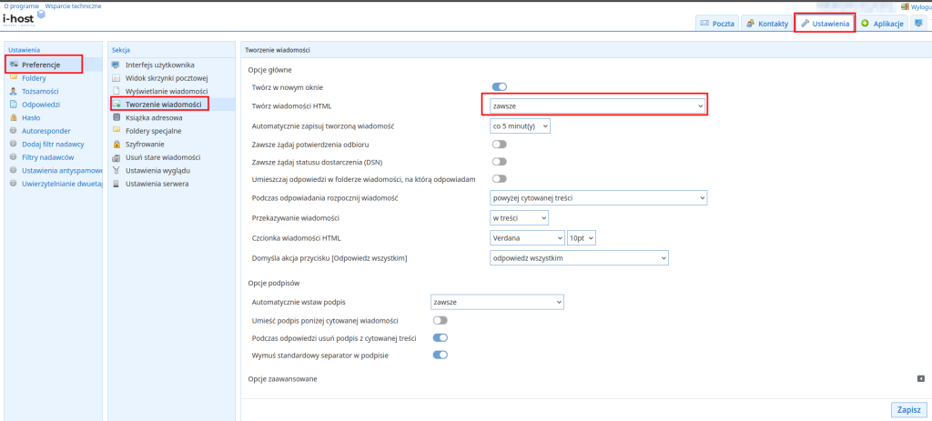 aby stopka zapisana w html wyświetlała się poprawnie w treści wiadomości, należy włączyć automatyczne tworzenie wiadomości w html: