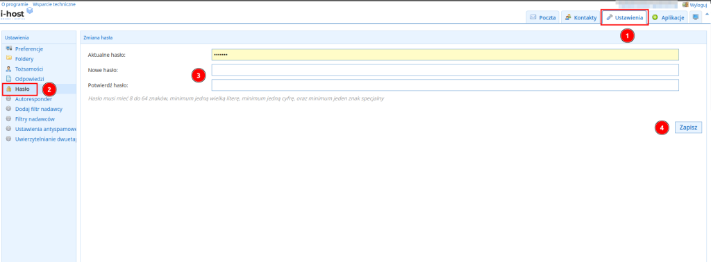 Zmiana hasła do skrzynki 2 lata ago Angelika Kurzyńska 1 minute Hasło do swojej skrzynki e-mail możesz zmienić za pośrednictwem webmaila w zakładce Ustawienia → Hasło