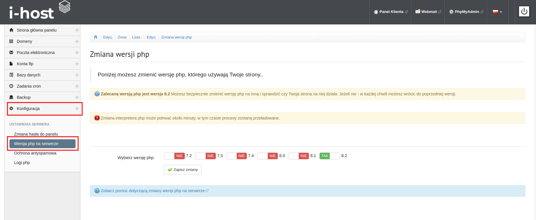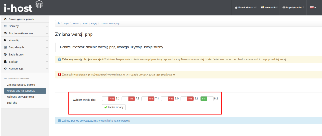 W oknie zaznaczamy wersję php i klikamy zapisz zmiany.